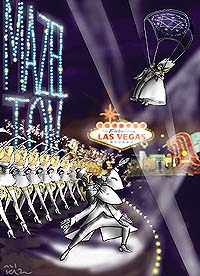 "I will be delighted to marry you. When are you flying in? How much time do you have? You want the huppah on the same day of arrival? In our temple or in a hotel? Are you Jewish?" The woman, calling from France, is flying to Las Vegas to be married under a huppah (the Jewish wedding canopy) by Mel Hecht, a highly competitive Reform rabbi in a Jewish growth industry at this paradise of gambling, entertainment and love. About 110,000 people marry every year in Las Vegas, in 50 wedding chapels or hotels. Thousands are Jewish. The cheapest and simplest ceremony is the so-called drive-in wedding: a civil marriage sealed from a drive-through window. "The tunnel of love," it is called. It is like buying a hamburger. You don�t even have to get out of the car. But no one offers a drive-in huppah. For a real huppah, Las Vegas-style, you have to go to an upscale chapel, a hotel, or a temple. Why do people want a huppah in Las Vegas? Because you can get a marriage license for $35 with no questions asked. Rabbi Hecht does not ask many questions either. He has been a rabbi in Las Vegas for 20 years. He performs 60-80 weddings a year, most of them in his Beth Am temple or in hotels. It was no accident that the question whether the couple from France was Jewish came only at the end. "How do I know they are single?" he asks. "I don�t. How do I know they are Jewish? I don�t. But that is their responsibility, not mine. I will talk to them before the wedding, but ultimately it is their problem." Not all Las Vegas rabbis agree. Conservative Rabbi Felipe Goodman only marries couples he knows. He says he wants to be sure he is marrying Jews. Hecht and 11 Reform colleagues do it to supplement their incomes. There are even some "rabbis" who bought their diplomas from a "mail rabbinate" in New York just to be able to perform weddings. Hecht does not do the cheap chapel wedding because there is no money in it. "What I charge comes off their profit," he explains. "The chapels are an in-and-out affair. They charge so little for a wedding that there is not a lot left for an outsider. Also, the chapels tell you how much time you get, usually 15 minutes. That�s something I want to determine for myself. For me every huppah is as if it is my first huppah." Weddings in the big luxurious hotels are a different story, usually with a reception, a dinner, a video and a cake. "I bring the glass and the wine and a portable huppah," Hecht says. These are included in the package, which runs from $150 to $1,200. The whole ceremony takes between 15 and 30 minutes, including the prayers, the vows, the breaking of the glass and a speech by the rabbi. A Los Angeles couple, Erwin Socol, 62, and Vicki Herman, 50, went under the huppah in the Hilton Flamingo Hotel at the end of August. Both had been married before, and they wanted a cheap and simple affair. It cost them $750, including a $200 fee for Rabbi Hecht and a $50 donation to his temple. "In Los Angeles it would have cost a fortune," says Erwin. "If you want something fast, smooth and simple, go to Las Vegas." Another California couple, Larry and Cheryl Redman, were so pleased with their Las Vegas marriage 15 years ago that they go back every year to renew their vows. A retired conservative rabbi, Louis Ledderman, performs more than 1,000 weddings a year in the luxurious MGM hotel, the biggest in the world with more than 5,000 rooms, a huge casino, restaurants, swimming pools and a shopping mall in the style of a film studio. Most of them are civil ceremonies. MGM has just completed a lush $2 million wedding chapel, which is conveniently located in the shopping mall, next to a Mexican restaurant, an optician�s and a clothes store. Ledderman shows off the conference room with a number of wedding magazines on the table. Here he prepares the couples for marriage. There are also separate dressing rooms for the bride and the groom, where they can take a shower and a rest. No cheap paper towels, Ledderman boasts, but real expensive cotton. The chapel is decorated with black and white pictures of such movie stars who pledged their troth in Las Vegas as Elvis Presley, Frank Sinatra and Elizabeth Taylor. It looks like a courtroom, with a podium for the couple and rows of chairs for the public. No religious images, neither a cross nor a Magen David. In the hotel, Ledderman is known as Dr. Ledderman, not rabbi. Otherwise, he explains, Christian couples might be put off. "But most," he says, "find it cool to be married by a rabbi." His civil weddings take 15 minutes for the ceremony, 15 minutes for the pictures. A video is ready for viewing right away in a special room. Christian clients are generally content if he mentions the "heavenly father." If they insist on Jesus Christ, he will refer them to a chaplain. But that is the exception. The ceremony does not have to take place in the chapel. Some couples choose the sinking ship on Treasure Island, or the top of a mountain. Every request, however extravagant, will be seriously considered. Relatives and friends don�t have to fly in. A hook-up to the Internet can be arranged, and they can join in from their computers at home or in the office. Huppot are available for $205 extra in the hotel, $350 elsewhere. The kosher witnesses, required by Jewish law, are no problem: there are enough Jewish workers in the casino. Many Jewish couples take the civil ceremony, but want to break the glass to keep the pieces as a souvenir. That�s OK by Ledderman. But the hotel rabbi doesn�t do weddings on Shabbat, which costs him a lot of money. "I could make a fortune," he says, "because Saturday is a busy wedding day." Instead he worships at one of Las Vegas�s two Lubavitch congregations. He emphasizes that he performs weddings in the name of the State of Nevada, not as a former official of the Conservative movement. "I don�t care whether the cere-mony is Jewish, Christian or Muslim. There is no discrimination here. The wedding is universal. 